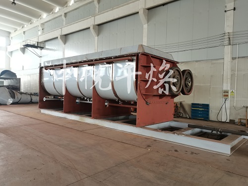 空心轴上密集排列着楔型中空浆叶,热介质经空心轴流经浆叶。单位有效容积内传热面积很大,热介质温度从-40℃到320℃,可以是水蒸汽,也可以是液体型:如热水、导热油等。间接传导加热,没有携带空气带走热量,热量均用来加热物料。热量损失仅为通过器体保温层向环境的散热。楔型浆叶传热面具有自清洁功能。物料颗粒与楔型面的相对运动产生洗刷作用,能够洗刷掉楔型面上附着物料,使运转中一直保持着清洁的传热面。浆叶干燥机的壳体为Ω型,壳体内一般安排二到四根空心搅拌轴。壳体有密封端盖与上盖,防止物料粉尘外泄而充分发挥作用。
